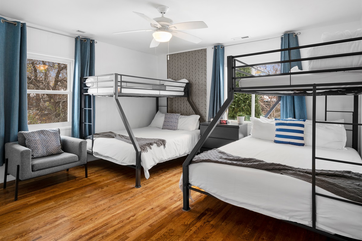 The space includes 3 king, 7 queen, and 2 twin sized beds to comfortably sleep up to 22 guests.